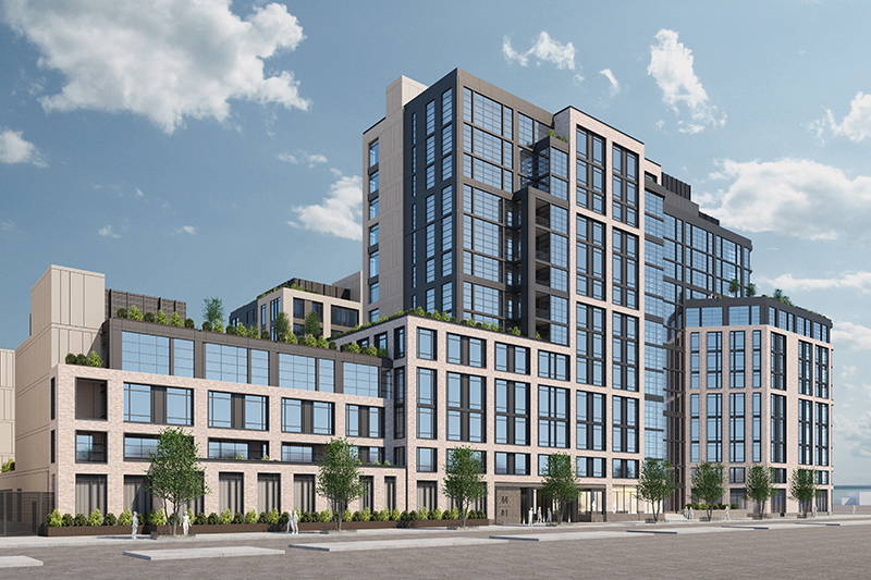 Designed by Hill West Architects, the building will include a mix of one and two bedrooms; 20,000 s/f of amenities; 200 parking spots; and 25,000 s/f of retail facing Northern Blvd. The design pays homage to the city’s industrial past with a composition of masonry and blackened metal by taking cues from the immediate context. Upon arrival through the car court, residents will be greeted by a lobby and gardens. At the upper level of the gardens is a lawn connecting back to the second-floor amenities opening up to a gym, yoga studio, children’s playroom and resident lounge. The second amenity level is located on the 10th floor, providing views of the Manhattan skyline from the co-working lounge, library and chef’s kitchen leading out to a rooftop deck.