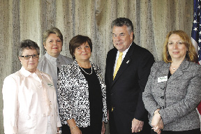 On May 14th U.S. congressman Peter King addressed WEDLI at their 16th Annual Legislative Breakfast. King provided some insight into the inner workings of Congress and gave his take on the frustrations of 'doing business' on both sides of the aisle. Shown are: WEDLI legislative co-chair Judith McEvoy; WEDLI legislative co-chair, Judith White; WEDLI president, Lucille Wesnofske; King; WEDLI event sponsor, Patricia McMahon, vice president Grumman Aerospace Systems Battle Management & Engagement Systems Division Northrup Grumman Corp.