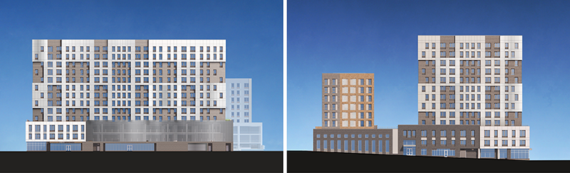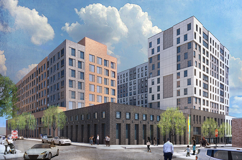 The program includes about 40,000 s/f of building amenity dedicated to the general population in the form of a gym with a basketball court and an incubator space to encourage new businesses in the community. Architectural design elements such as glazing for the recreational facility will be used to connect the gym with the immediate neighborhood. The recreational facility is situated as a distinct cornerstone of the two residential buildings, thereby having its own identity while at the same time unifying the two buildings.