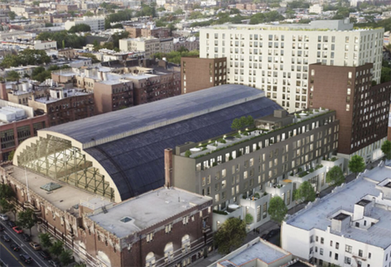 When completed, the mixed-use development will house the recreational and cultural facilities in the original armory, which will include a swimming pool, three hardwood basketball courts with bleachers, five dance studios, film screening and performance facilities, and a new district office for Community Board 9/Brooklyn, among other features and amenities. The eight-story and 15-story residential buildings will feature a total of 415 rental units, of which 250 will be lower- and affordable-income residences. In addition, 60 condominium units are planned.