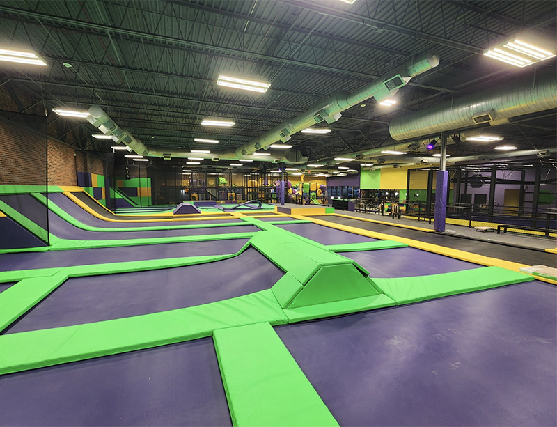 This 25,000 s/f park is packed with wall-to-wall trampolines, foam pits, dunk lanes, ninja obstacle features (warped walls, fidget ladders, etc.), dodgeball court, fly rail and so much more! Get Air even has a special section of the trampoline park for jumpers under 46 inches tall. Additionally, this new park includes party rooms and areas suitable for company gatherings, family reunions, birthday parties and other events.