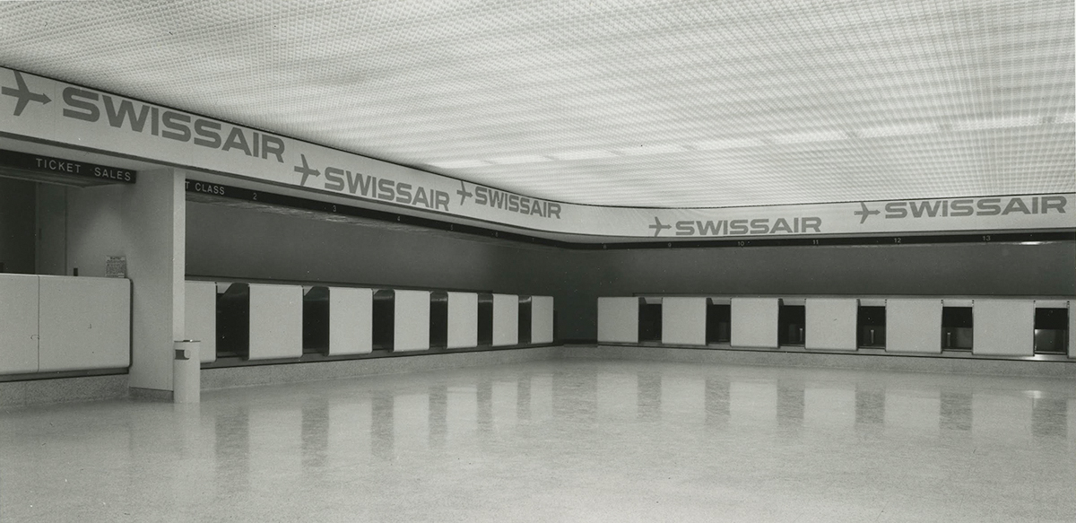Swiss Air terminal at JFK International Airport completed by John Gallin & Son in 1972. Photo Credit: American Studio - Herbert Helweil.