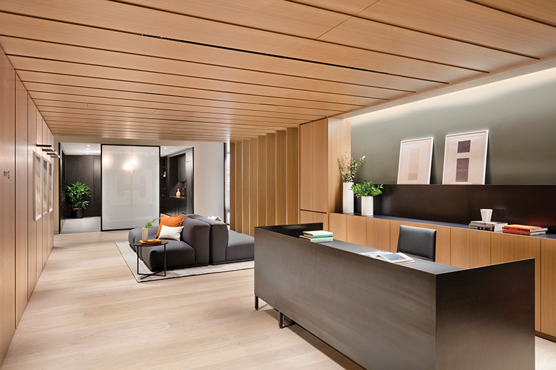 As employees and guests process from the elevator lobby, they enter a reception area fitted with a sleek, custom desk and medium-toned walnut surround. A series of vertical fins appears in the millwork, which integrates storage and lighting. (This treatment also pays homage to the building’s history as a home to a carpenter’s union.) Just beyond the reception is a low-profile seating area, ideal for casual conversations or supporting waiting guests. Past this seating, there is a pantry, also fitted with millwork—this time, blackened white oak veneer—concealing appliances and storage. A monolithic, concrete-toned island anchors the space with a linear, contemporary pendant suspended overhead. The pantry’s backsplash is made up of black marble.
