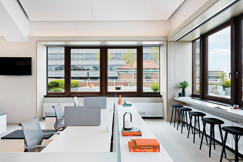 The immersive nature of these entry spaces lends a feeling of compression that recedes when one enters the firm’s new sunlit, light-finished open workspace. Ceilings in this space soar 16 ft. high, and generous glazing on three sides gives occupants views of the city and landscaped terrace. A strong horizontal datum in the open office creates a cohesive look and up-lighting serves to make the ceiling appear lighter.
