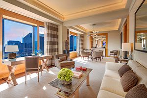 Italian Breccia Oniciata marble enhances the bathrooms which include separate glass enclosed showers, oversized deep-soaking tubs, many with Jacuzzis, which fill in two minutes, remote controlled mirrored televisions and Bvlgari amenities. Accommodations feature walk-in English Sycamore closets with a separate make-up area. Curved 65-inch and curved 55-inch HD televisions bring an entertainment experience with a feeling of being immersed in the picture itself in every suite.