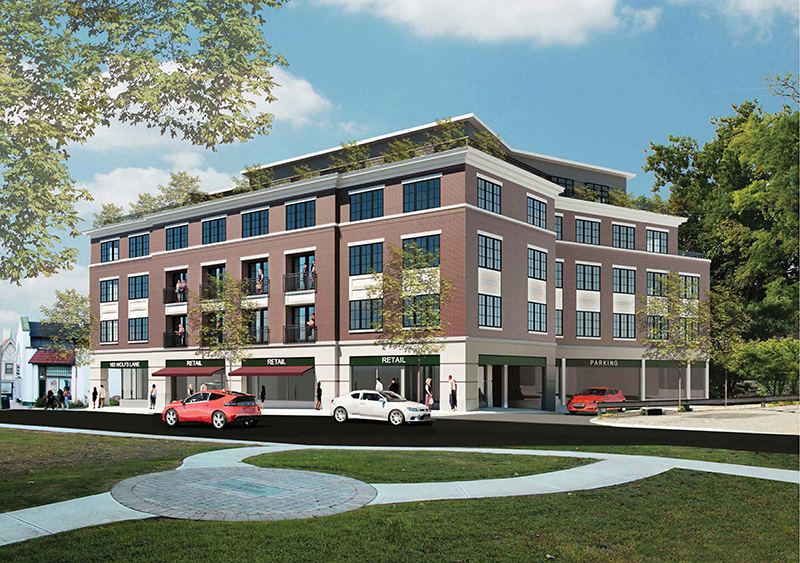 Proposed development of the site would feature a 40,858 s/f building plus 10,902 s/f lower level garage,13 one-bedrooms, 11 two-bedrooms (two with terraces), 3 two-bedroom plus den penthouse with oversized terraces, 34 parking spaces in garage with two-car elevators/lifts.