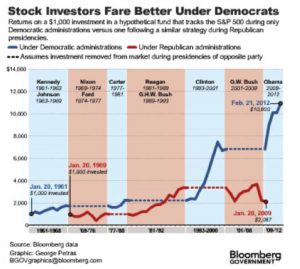 According to a study by Alan Binder and Mark Watson, based on history, looking at economic performance, one contest is clear: the broader economy outperforms under a Democratic presidency by, what the economists call, an “astoundingly large,†1.79% percentage point gap. Their study asserts that analyzing real gross domestic product growth under all the U.S. presidents since World War II, from Truman to Obama, average expansion ran 4.33% under Democrats versus a much lower 2.54% under Republicans. Adjusting for recession changes the relative performance significantly, as Republican administrations were, as Blinder and Watson cite, more likely to be in office when one hits.