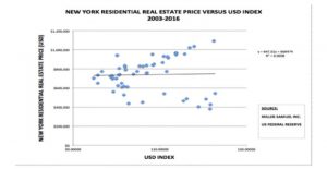 Using very general statistical analysis the level of the USD, as captured by the USD Index (NDY), has over the past 13 years, shown to have little correlation or ultimate influence on the New York residential real estate market. .The USD Index is a weighted average of the foreign exchange value of the U.S. Dollar against the currencies of a broad group of major U.S. trading partners.