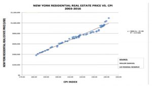 The same analysis applied to the relationship between inflation and the level of New York City residential real estate is more pronounced and sustained.  The conclusion of this basic analysis is that inflation, in this case muted and predictable, shows a very high correlation with the level of New York Sales prices.