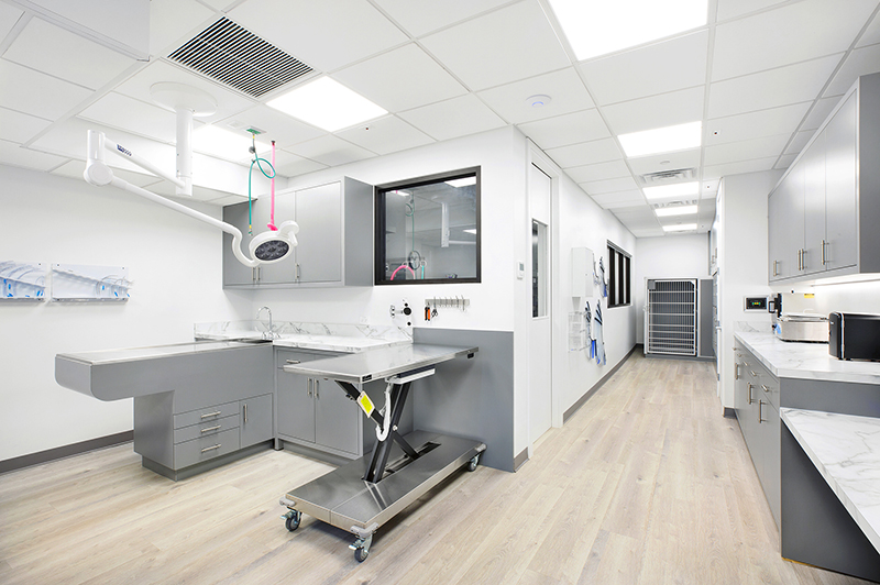 “A custom reception desk with Equitone fiber cement cladding and a white quartz countertop faces the entrance. Opposite the desk is a waiting area with a built-in curved polyurethane leather-upholstered banquette and recessed display shelving. A cluster of three pendant LED fixtures highlights the waiting area. The 1,300 s/f exam room and surgery suite areas are arranged along a double loaded corridor behind the lobby,” said McAlpine’s director of construction administration Adrian Vasile.