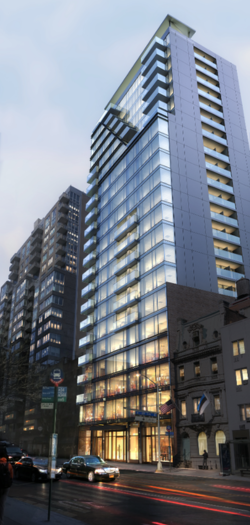 Located at 237 East 34th St., the Theater House is a 22-story glass tower in the Murray Hill and Kips Bay neighborhoods. The property offers residential units that feature wrap-around glass curtain walls and private outdoor space.