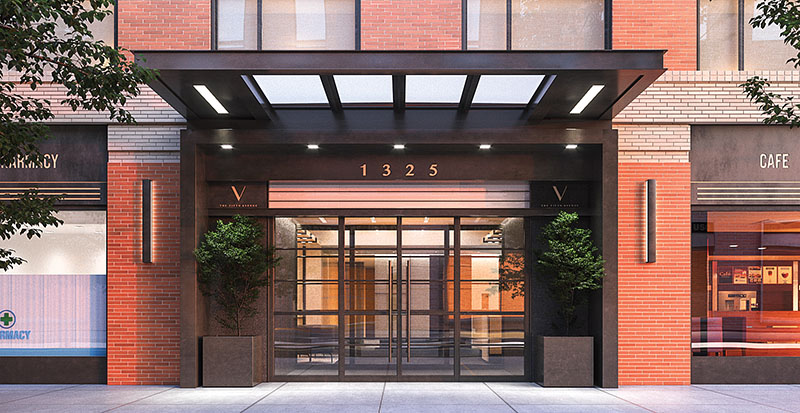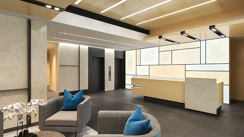 Limestone cladding and antiqued bronze plate accent the upgraded façade, where a metal and glass overhang highlights the residential entrance. The custom metal work continues into the building lobby where it forms the frame for a “light wall,” consisting of glass mounted over individual LED “lumisheet” panels.