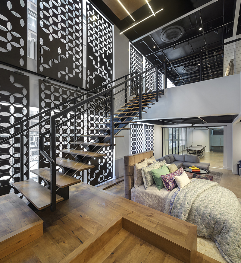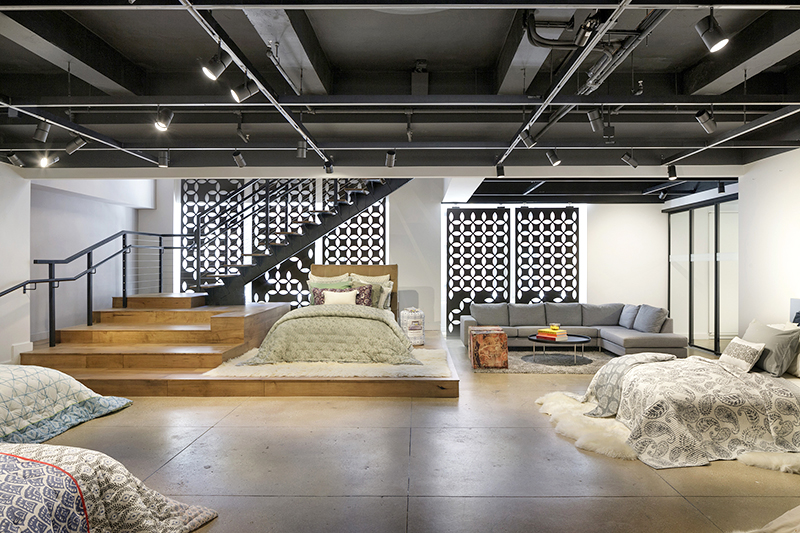 Pem required a space to both showcase collections and entertain customers during Home Fashion Products Association Market Week. “In response, we developed a design that incorporates modern materials, extensive open spaces, and custom fixtures,” said MD project manager Ajay Waghmare, LEED AP. “These include the custom-designed, powered, movable wall panels, engineered by our team for flexibility and ease of reconfiguration.”