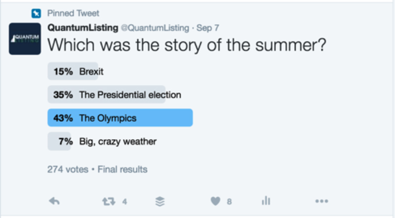 The choices were: Brexit, the Presidential election, the Olympics, and big, crazy weather. Hearken back to June, when for a week or so, the 24-hour news cycle was obsessed with Brexit, the United Kingdom’s referendum on whether it wanted to leave the European Union or remain. To my surprise, the Leave vote carried the day by a 52-48 margin. International markets went into a short-lived panic and pundits had a field day, but in the end only 15 % of our Twitter voters thought it was the story.