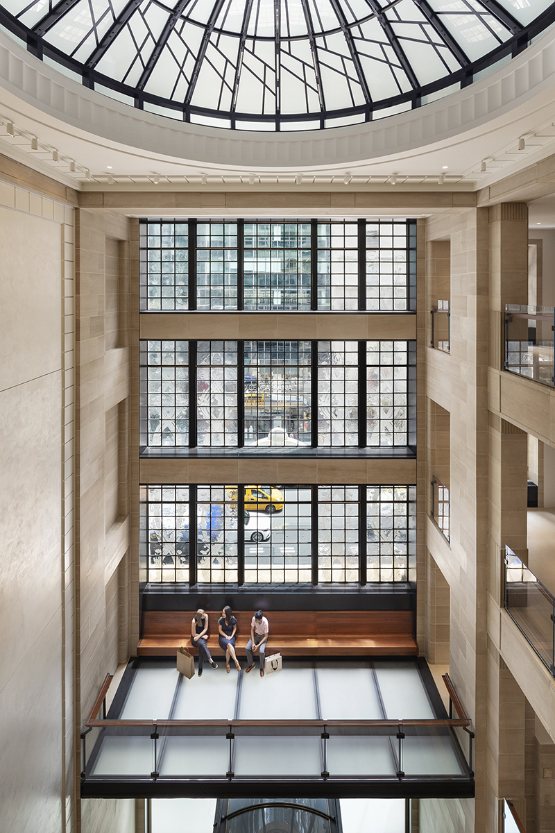A guiding principle of the renovation was to celebrate, protect and preserve the historic Lalique windows — which date back to 1910, feature Art Nouveau flowers, and span from the second to fourth floors. Originally, catwalks across three floors of the internal perimeter decreased visibility of the windows. To allow for unobstructed views and improve the reach of natural light in the building, the team removed two floors of catwalks and installed a glass viewing balcony, including glass railings on the second floor.