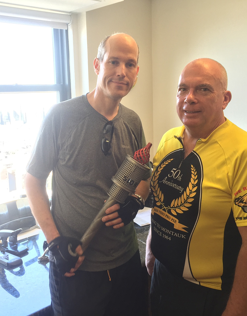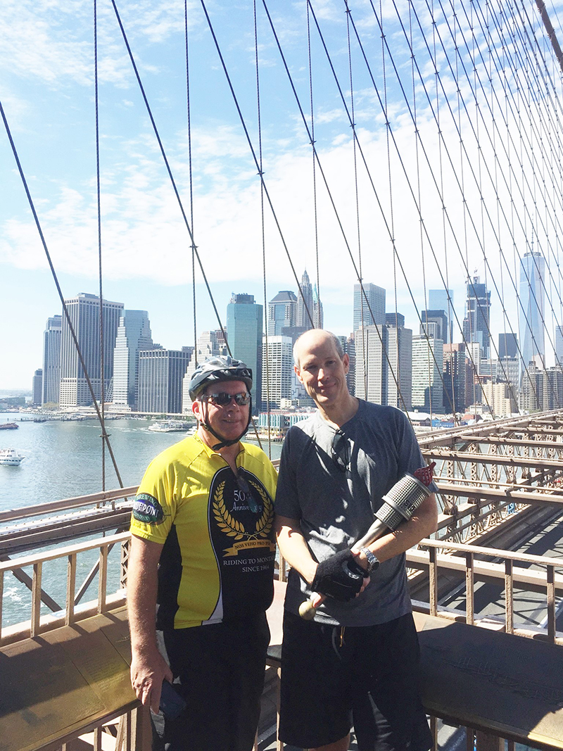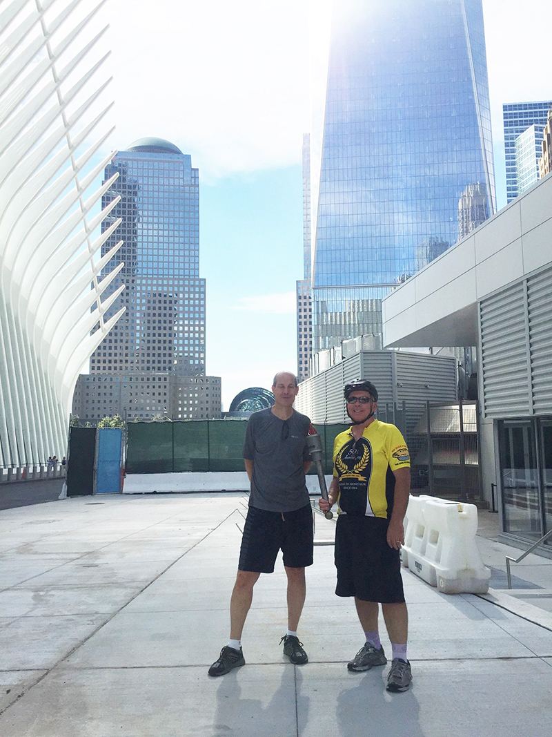 rd Robert Hebron, SIOR and William O’Brien, SIOR had the opportunity to meet in Brooklyn and transport The Torch over the Iconic Brooklyn Bridge via bicycle and into lower Manhattan, ultimately ending up at the foot of The Freedom Tower and the adjacent $4 Billion Oculus Hub Connection to Fulton Center. The adjoining 911 Memorial was not missed either, as both Robert and Bill paused with Bill’s brother Michael O’Brien III, SIOR to remember the many families impacted by The Terrorist Act that occurred, on this hollowed ground some 15 years prior.