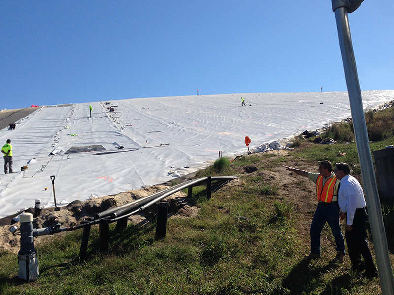 Farmingville, NY On September 25, Supervisor Ed Romaine visited the Brookhaven Town Landfill to survey the progress of the Cell 5 and 6 Phase E capping project. This $2,125,000 project includes rough, fine and finish grading by Town Waste Management employees, followed by the installation of a geosynthetic composite and geosynthetic liner by outside contractors to cover the nearly 14 acre site. By utilizing town workers, there will be a multimillion dollar savings when compared to similar projects utilizing only outside contracted work forces. Once all of the liner and protective cover components are complete, a final vegetative cover is placed over the cap and typical vegetation similar to what is indigenous to the area is planted. The town expects completion by the end of November 2015.
