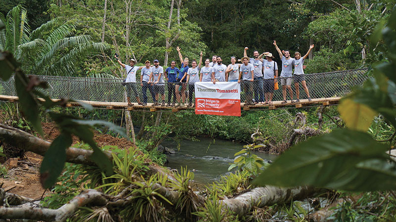Boca de Lura, Panama As part of the firm’s TT Gives Back initiative, a team of 10 Thornton Tomasetti engineers from six offices recently traveled to Panama’s Coclé Province for an international service mission, partnering with Bridges to Prosperity to help provide a crucial passage over the Lura River for area residents. Since 2001, Bridges to Prosperity has built nearly 300 suspended pedestrian bridges in isolated communities across 22 countries.