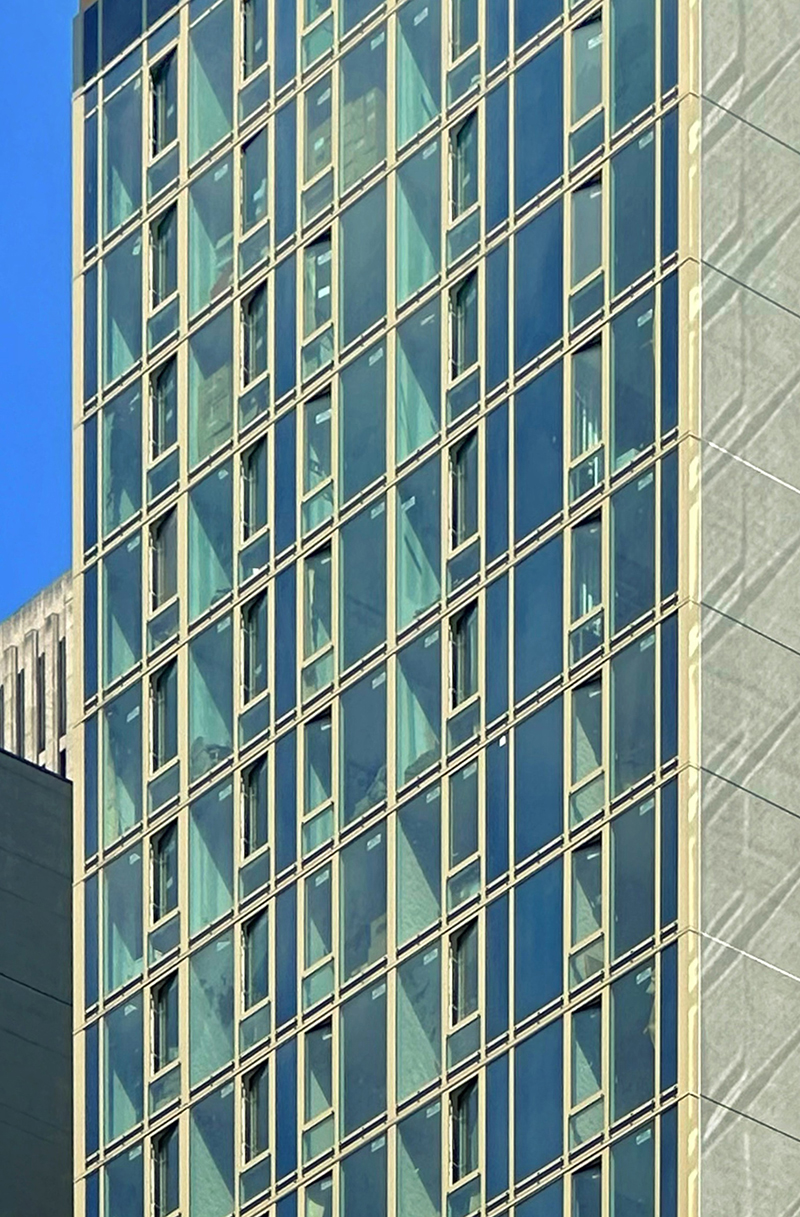 Insulated glass units (IGUs) were specified for all the fixed vision, operable vision, and non-bypass spandrel window wall panels. The IGUs were either 1” for fixed panels or 1-¼” for operable panels and used double glass, Technoform spacers, and argon gas filling. The vision panels used low-E Guardian SN68 glass, while the non-bypass spandrel glass was tempered and back painted a custom Ford Blue color. As required by New York City code, bird-friendly patterns were used on all the vision glass for the lower floors of the hotel. The slab bypass panels used single pane ¼” monolithic tempered glass with a custom Ford Blue back painted interior facing surface.