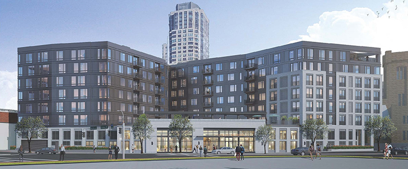 The building’s amenities will include a pool, garden terrace, BBQ grills, exterior fireplace, and seating area. Additional amenities being planned for the project include a fitness center, pet spa, bicycle storage, resident lounge, co-working spaces, and conference room. The garage will be two levels and above ground with amenity spaces along the street frontage and six floors of residential units above.