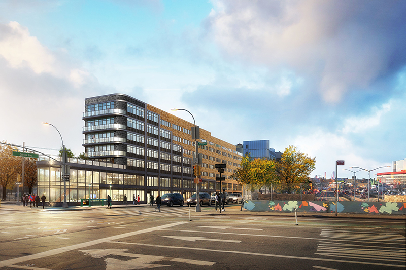 The first two floors will feature retail and community uses, while five residential floors above will offer a mix of studio, one-, two-, and three-bedroom apartments — including 19 affordable units made possible through New York City’s 485-x program. A below-grade garage will provide 153 parking spaces for residents and visitors, complemented by such building amenities as a fitness center, co-working lounge, clubroom, landscaped rooftop terrace with grilling stations, doorman service, and a live-in superintendent.