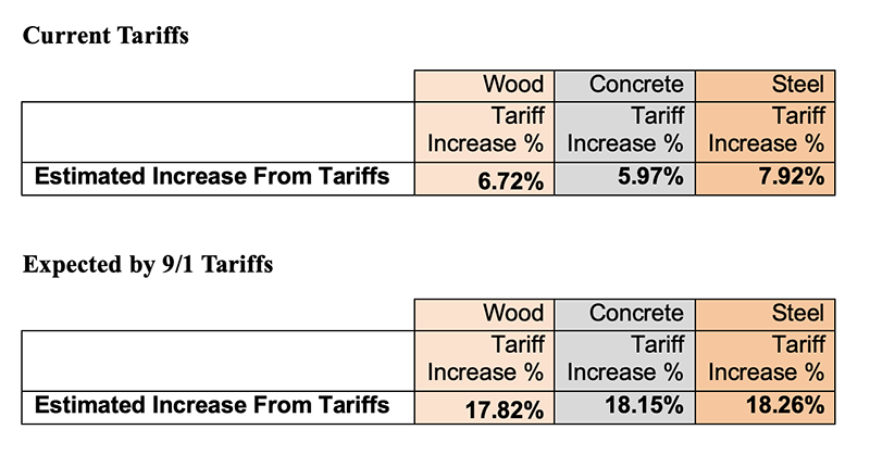 We’ve modeled the potential cost impact of these tariffs across three building types: wood-framed, concrete, and steel structures. In the graphic is a breakdown of the estimated tariff-driven percentage increases by trade.