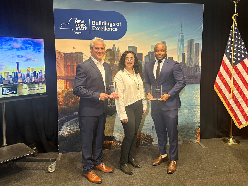 The award was presented at a ceremony hosted by NYSERDA, featuring speakers: Doreen Harris, president and CEO of NYSERDA, New York State Homes and Community Renewal (HCR) commissioner and CEO, RuthAnne Visnauskas, Jesse Lazar, Assoc. AIA, executive diirector of AIA New York, Illya Azaroff, FAIA, 2025 president-elect, 2026 president, AIA National; founding principal, director of Resilient Design and Regenerative Planning, +lab architect PLLC; Professor, New York City College of Technology (CUNY), Grayson Jordan, RA, AIA, CPHC, principal of Paul Castrucci Architects.
