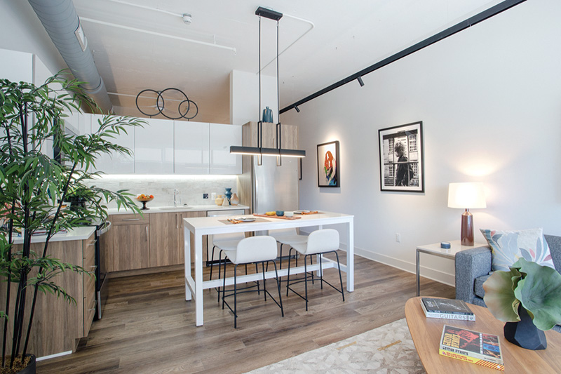 Each apartment features wide plank LVT flooring in living room and bedrooms; SoHo-inspired kitchens featuring custom cabinetry, quartz countertops and stainless-steel appliances; designer bathrooms with porcelain tiles, custom vanities and large mirrors; bedroom ceiling fans; washer & dryer and extra-large walk-in closets. Many of the apartments include bedroom cabinetry, gallery track lighting and modern chandeliers. The 1-bedroom/1 bath apartments and the 2-bedroom/2 bath apartments range in size from 425 to 1,170 s/f.