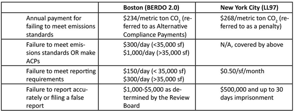 For buildings that do not meet emissions targets, Boston and New York have put similar prices on carbon above allowances ($234 and $268 per metric ton, respectively, subject to change in future compliance periods). These are referred to as Alternative Compliance Payments (ACPs) by BERDO 2.0 and penalties by LL97. BERDO 2.0 penalties and ACPs will be directed to the Equitable Emissions Investment Fund for allocation to various carbon abatement projects prioritizing affordable housing, air quality improvement, green jobs training, and MWDBE assistance. Penalties in NYC are currently directed back to the city with no specific usage yet defined. Other costs for failing to report, filing false reports, and in the case of BERDO 2.0, daily penalties for exceeding carbon standards while neglecting to pay ACPs are summarized in the table above.