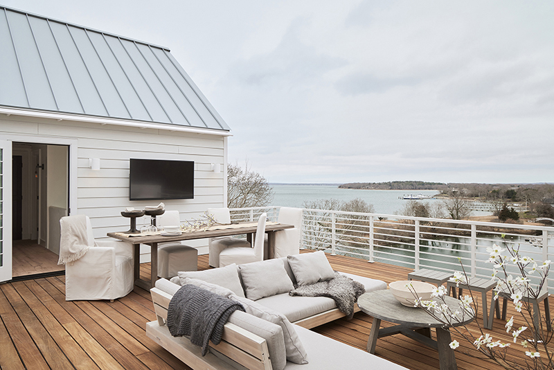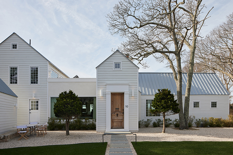 Notable for its stylish and sophisticated design, the residence is completed with an assortment of high-quality materials, including antique Turkish stone sinks, painted reclaimed wood from a barn in Maine, and polished concrete, all thoughtfully integrated with classic clapboard.