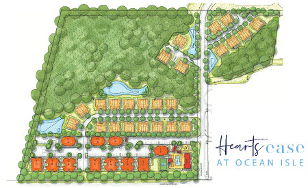 Heartsease at Calabash is designed with an eye toward in-migrating retirees with a low density of 4 units per acre. The highly-amenitized community includes single-level floor plans, one and two-bedroom duplex units as well as one, two and three-bedroom cottages. Luxury interior appointments, two-car garages, carports, private yards, and driveways are featured throughout. Prices are anticipated to range between $1,700 and $2,000 per month.