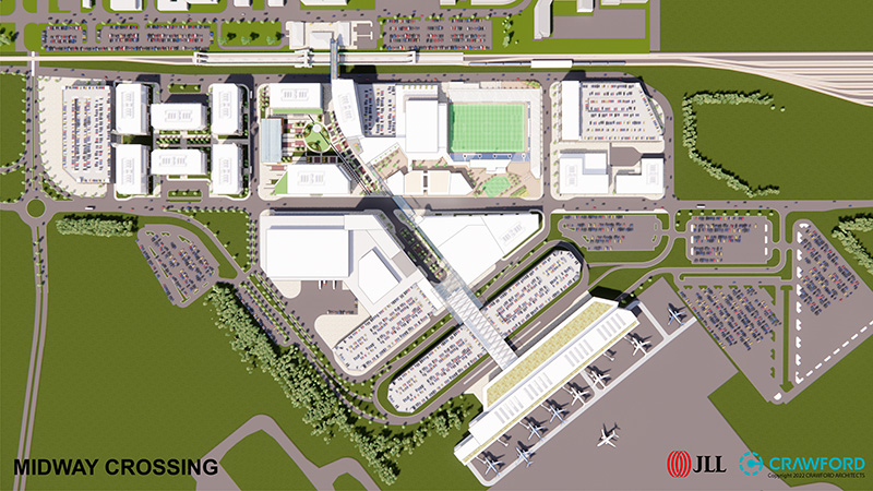 Midway Crossing’s modern technology would time trains, flights and traffic to reduce congestion, and it would be complemented by EV charging stations and bicycle infrastructure. A partnership between JLL and Siemens would create a microgrid to generate most of the site and the airport’s electricity from sustainable sources by 2030, and JLL is committed to a net-zero carbon footprint by 2040.