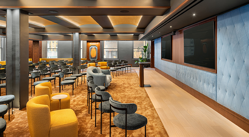 As a complement to the 7,500 s/f indoor/outdoor club floor, added as part of the initial repositioning at 10 Grand Central in 2018, tenants at the building now enjoy The Meeting Galleries which comprises a next-generation ‘town hall’ meeting lounge with seating for 200 guests (The Grand Gallery), a pre-function space (The Bar Car), a sound-attenuated podcast room (The Podcast Gallery) and a theater room (The Screening Gallery). In a nod to nearby Grand Central Terminal, The Meeting Galleries space exudes a luxury train liner aesthetic harkening back to the 1930s when hospitality was king and white glove experiences were reserved only for the elite. Today, a hospitality-infused sensibility combines luxury hotel ambiance with workspace utility.