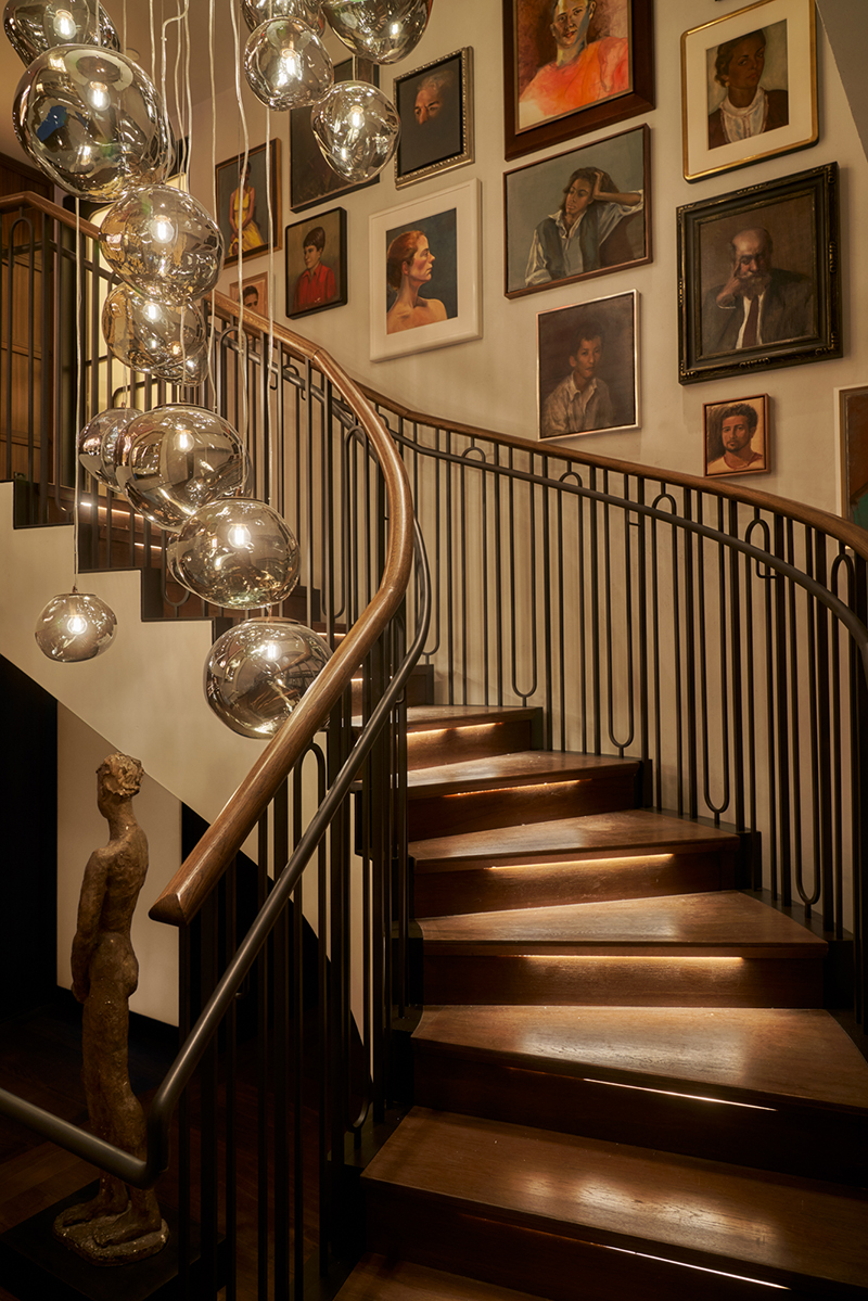 Artwork tells the story of chef Michael White’s culinary journey and is central to the design. Many works are featured throughout the various dining rooms, including a portrait gallery within the double-height staircase area. The curved staircase with tread lighting brings diners up to the mezzanine area for an exceptionally crafted private dining room experience with a 14-seat custom marble table and geometric wood inlay flooring.