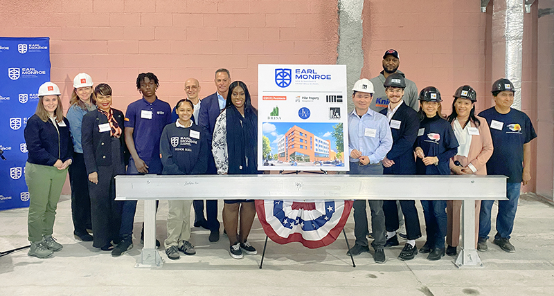 Bronx, NY School leadership, students, former NY Knick John Wallace, borough president Vanessa Gibson and the project team of developer Pillar Property Management, the architectural team of ESKW/Architects and IMC Architecture, construction manager JV Construction & Consulting, structural engineer CityScape Engineering and general contractor Brisa Builders celebrated a topping-out for the Earl Monroe New Renaissance Basketball School (EMNRBS). During the event, the guests, students and the project team members signed the last steel beam to be installed atop the building.