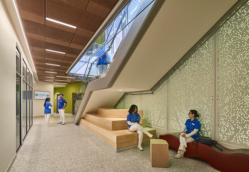 Urbahn’s in-house design team also included principal architect Martin Stein, AIA, LEED AP; associate and project manager Joseph Zappulla, CPHC and associate and designer Jonathan Ruiz. The project team included healthcare design consultant HKS Architects, construction manager TDX Construction, structural engineer LERA, civil engineer Langan Engineering, MEP Engineer R.G. Vanderweil Engineers, landscape architect Edgewater Design, lighting designer Domingo Gonzalez Associates, and audio-visual engineer Cerami Associates.
