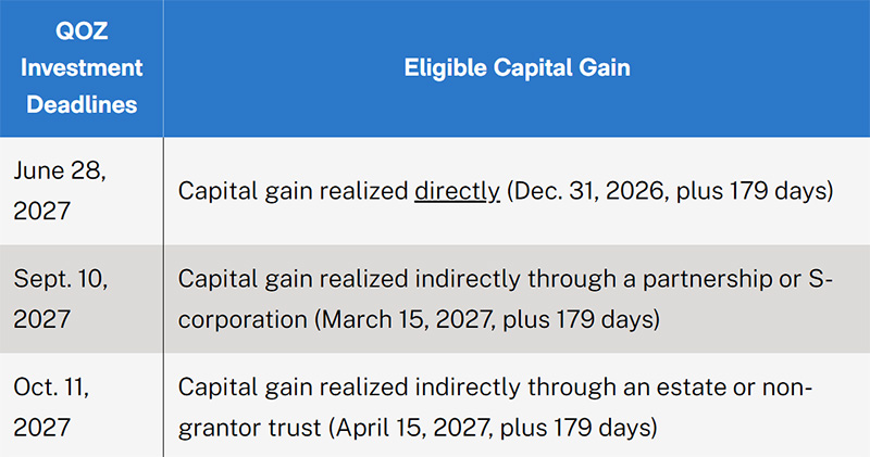 This means if a taxpayer realizes eligible capital gain on the last day of 2026 – the latest date eligible capital gain can be generated under current law to be eligible for reinvestment for QOZ tax benefits – the latest date(s) a QOZ investment can be made is as follows*:
