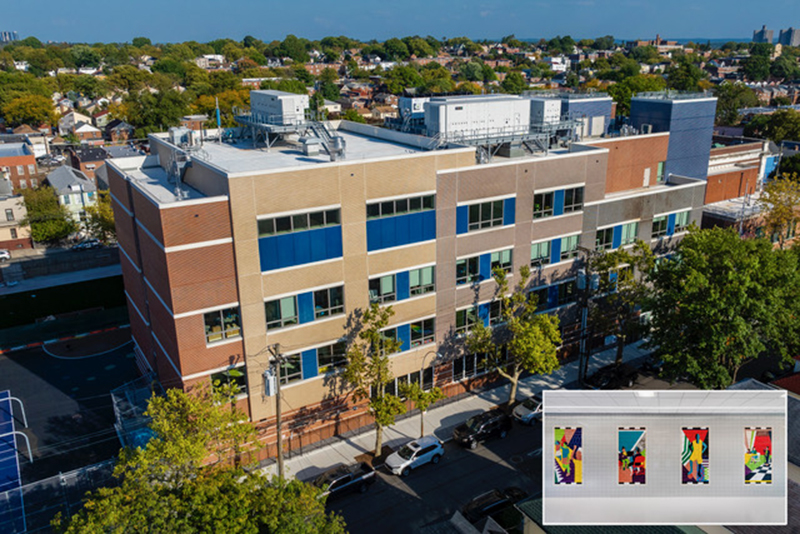 Public School 116Q. Slated for completion in 2026, this sustainably designed four-story 55,000 s/f addition to a preK-8 facility in Jamaica, Queens incorporates air source heat pump chillers for high-efficiency, all-electric heating and cooling. Additionally rooftop photovoltaic panels generate electricity, and a vegetated green roof reduces stormwater runoff. With all spaces served by custom-built variable air volume rooftop units with energy recovery ventilation and MERV13 filters for enhanced indoor air quality, the expanded school building is expected to meet both Green Schools Guide requirements and certification standards under LEED for Schools 4.1.