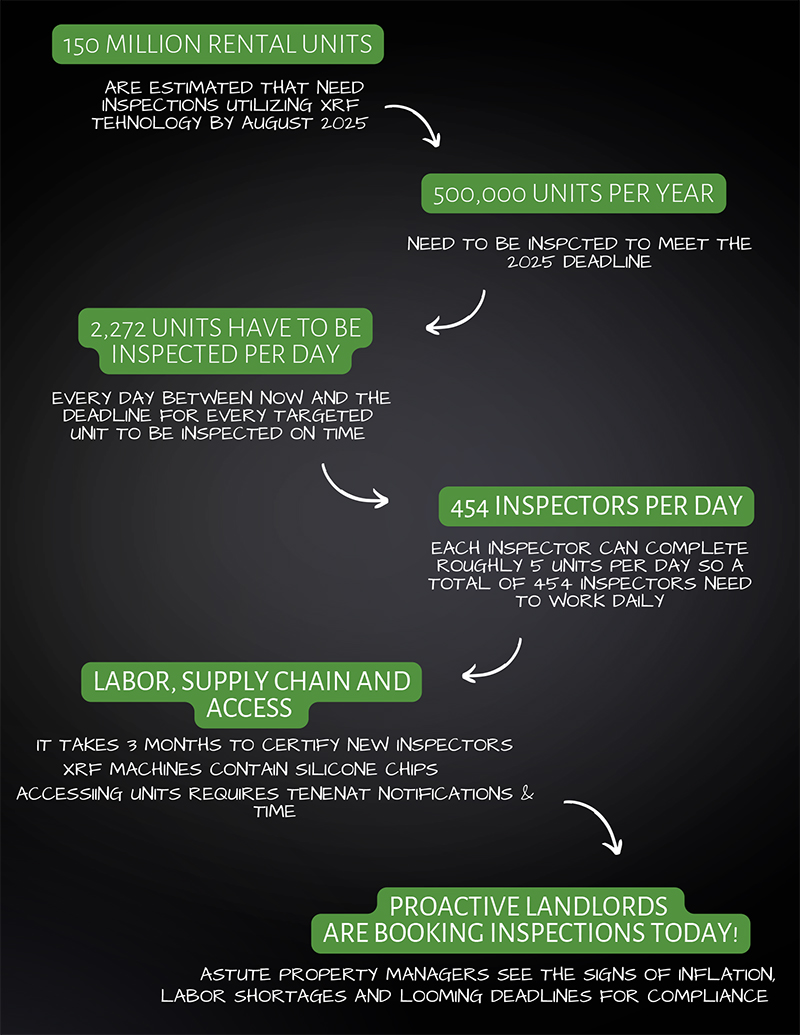 Wrong! Property managers and landlords who choose to wait are facing the risk of labor shortages, increased costs due to increased demand, and a backlog of work orders meaning inspections might not be completed in time for the August 2025 deadline the longer they wait. Having worked in the environmental services industry for over 30 years, my team and I see the crunch coming.